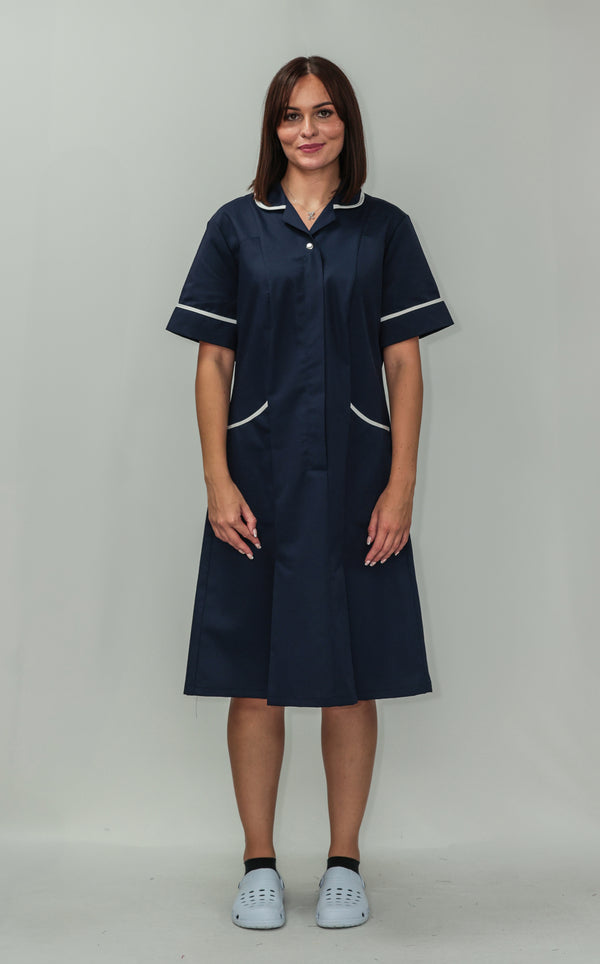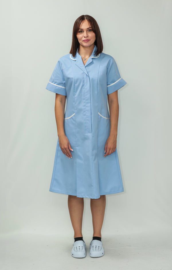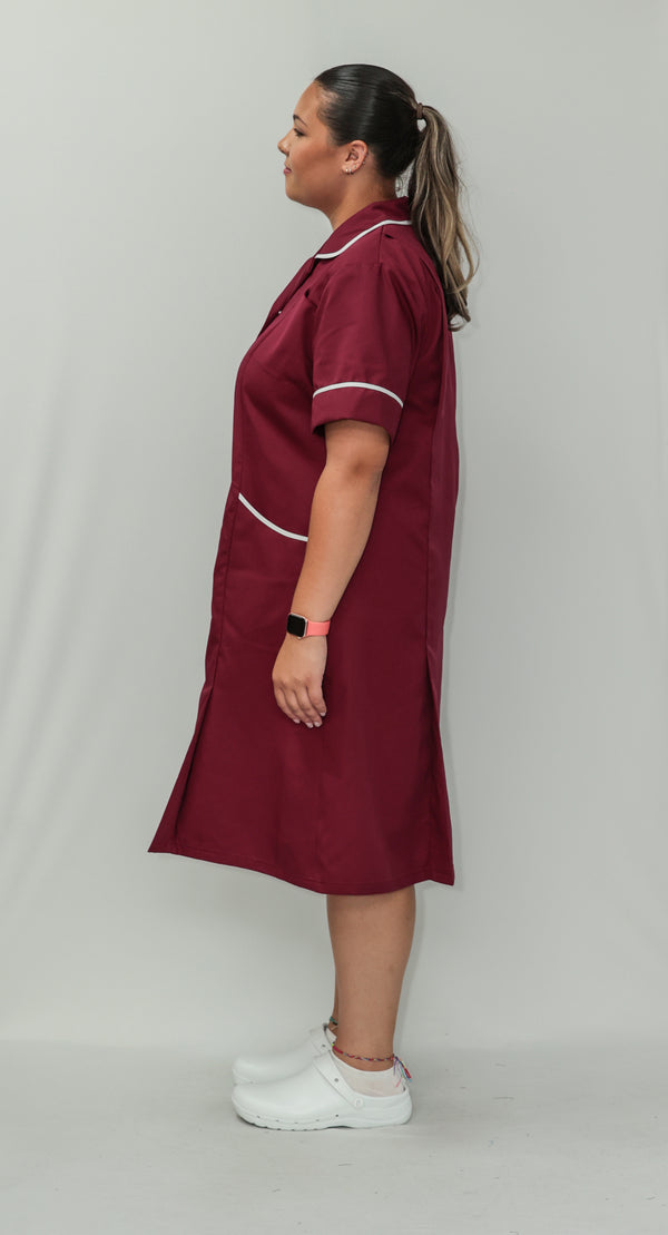 This women’s dress, made from a lightweight yet durable fabric blend of 65% post-consumer PET and 35% organic cotton, provides excellent breathability. Designed for longevity, this dress is guaranteed for 2,000 washes and can withstand washing temperatures of up to 75°C, ensuring long-term hygiene and freshness. With a 4-year lifespan, it delivers outstanding durability without sacrificing quality. The dress features a zip and silver popper fastening, allowing for easy wear and a secure fit, while a chest pocket and two spacious hip pockets offer practical storage for essentials. Finished with elegant white piping along the collar and sleeves, this dress brings a professional yet modern look to everyday workwear. It's available in Maroon, Light Blue, Royal Blue, and Navy Blue. It comes in sizes 6–24 to ensure a flattering and comfortable fit for all. As part of our sustainability commitment, this product has a carbon credit value and we also offer a buy-back program at the end of its life, allowing the dress to be recycled.