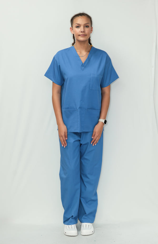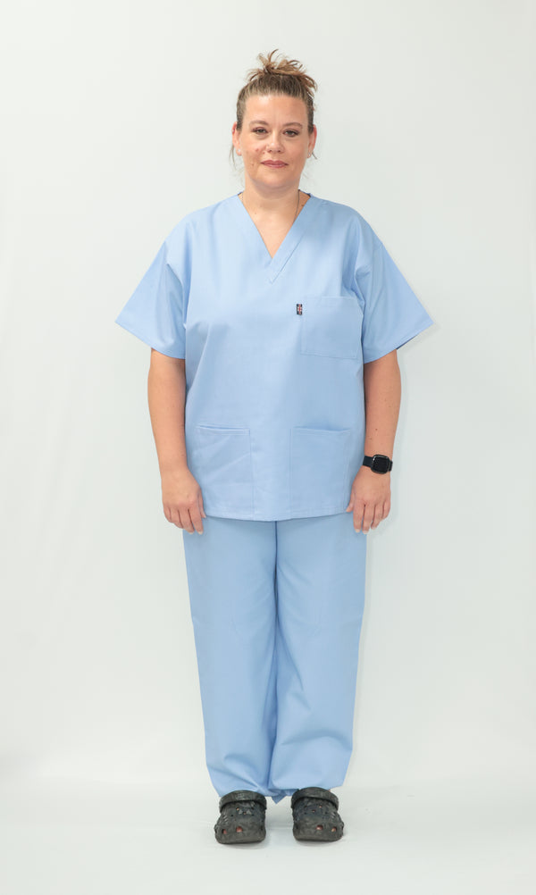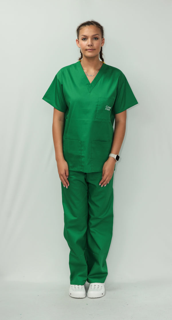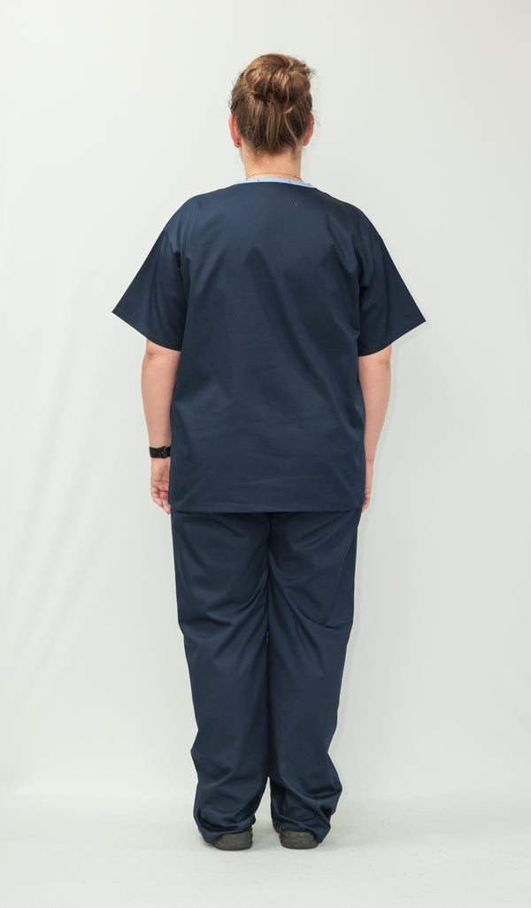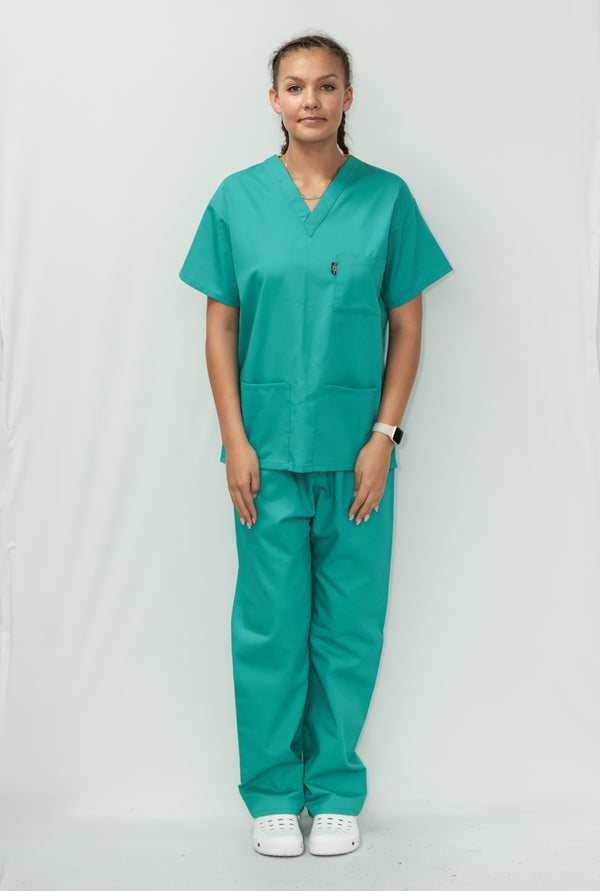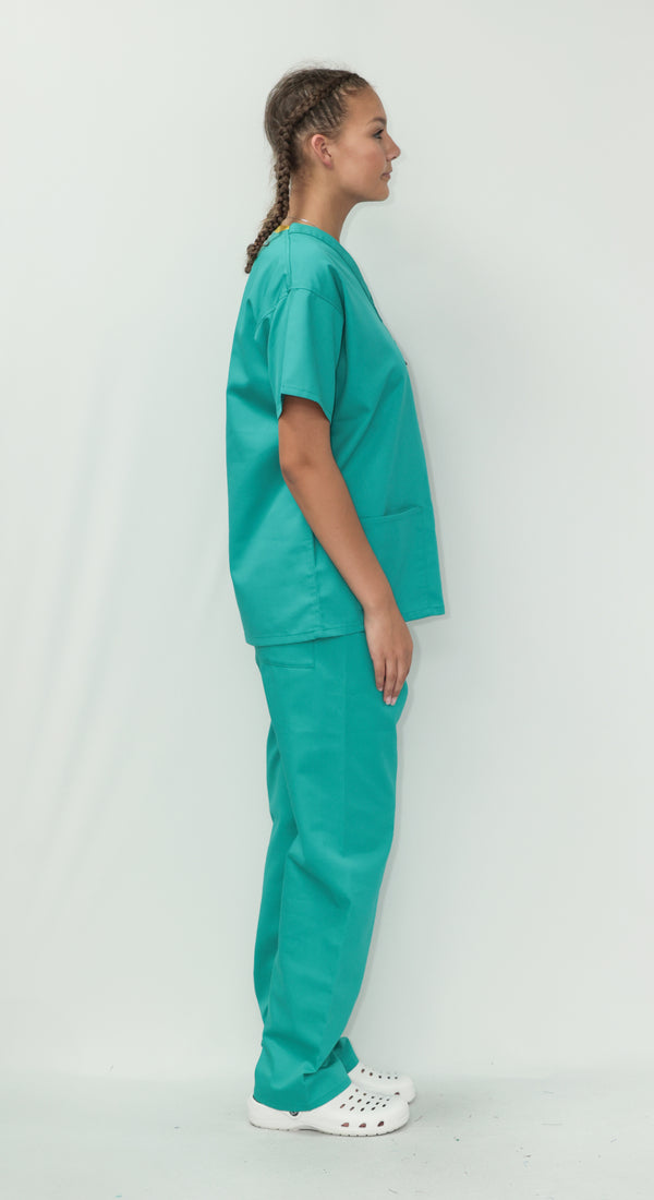 Our Unisex Scrub Set is an ideal choice for healthcare professionals. Made from 65% Post Consumer PET Polyester and 35% Organic Cotton, these scrubs are breathable and durable. The V-neck top features one chest pocket and two hip pockets, offering practical storage for essentials. While the bottoms are a classic straight leg cut which gives a relaxed but professional fit. Available in a wide range of colours, including Black, Grey, Navy Blue, Light Blue, Royal Blue, Hospital Blue, Turquoise, Aqua, Jade Green, Maroon, Lilac, Purple, Bottle Green and Emerald Green. With sizes ranging from X-Small to 2X-Large, these scrubs are sure to cater to every professional. Created to last, this scrub set is guaranteed for 2000 washes and can withstand washing temperatures up to 75°C, making it durable for regular industrial washing. As part of our sustainability mission, these scrubs have a carbon credit value and are included in our buy back scheme, allowing us to buy them back to be recycled again.