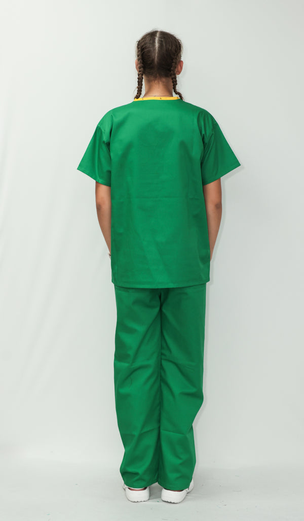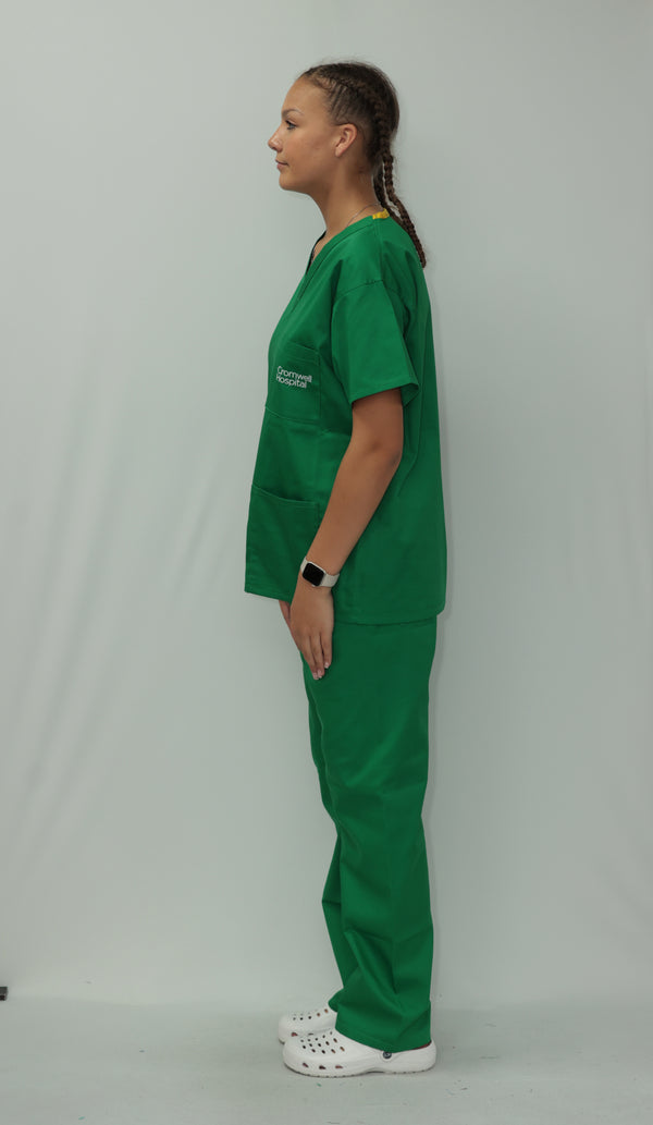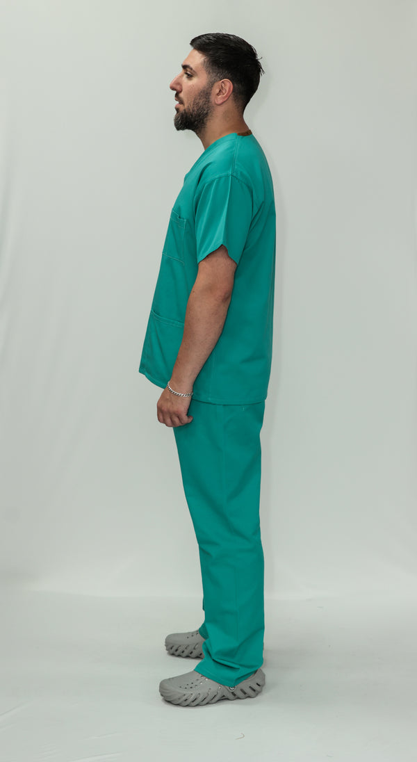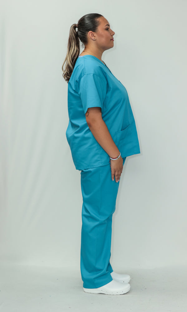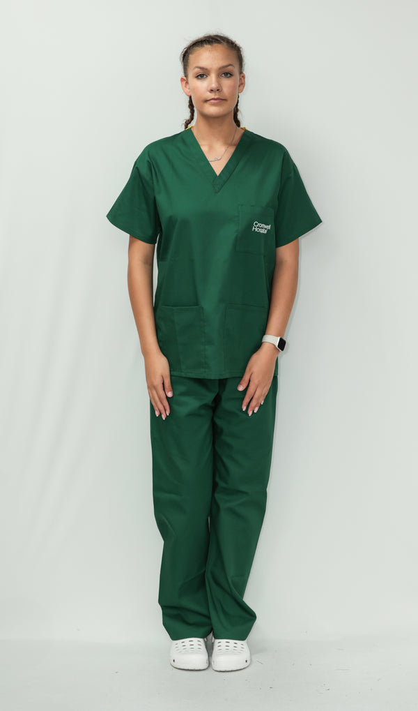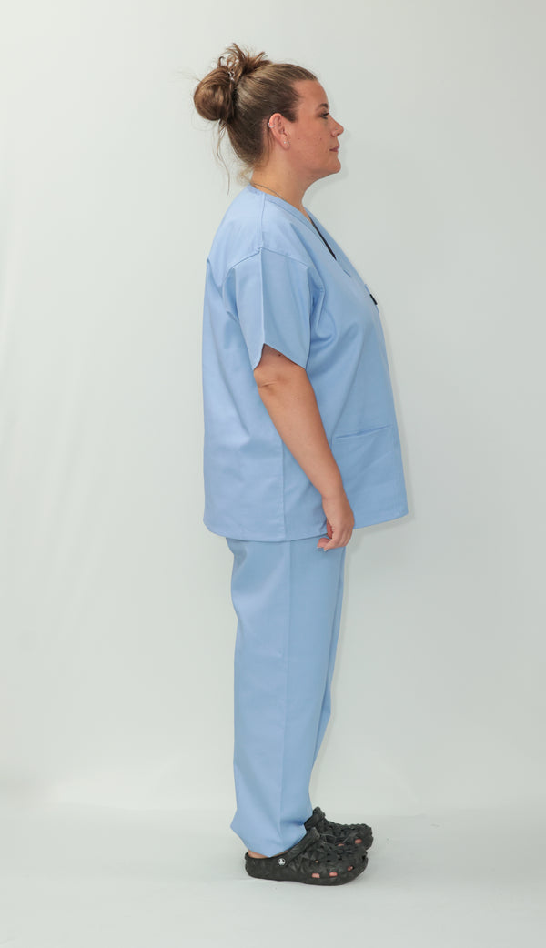 Our Unisex Scrub Set is an ideal choice for healthcare professionals. Made from 65% Post Consumer PET Polyester and 35% Organic Cotton, these scrubs are breathable and durable. The V-neck top features one chest pocket and two hip pockets, offering practical storage for essentials. While the bottoms are a classic straight leg cut which gives a relaxed but professional fit. Available in a wide range of colours, including Black, Grey, Navy Blue, Light Blue, Royal Blue, Hospital Blue, Turquoise, Aqua, Jade Green, Maroon, Lilac, Purple, Bottle Green and Emerald Green. With sizes ranging from X-Small to 2X-Large, these scrubs are sure to cater to every professional. Created to last, this scrub set is guaranteed for 2000 washes and can withstand washing temperatures up to 75°C, making it durable for regular industrial washing. As part of our sustainability mission, these scrubs have a carbon credit value and are included in our buy back scheme, allowing us to buy them back to be recycled again.